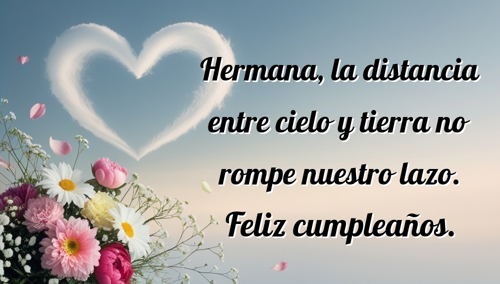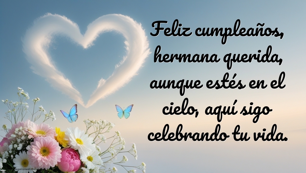Aunque tu hermana ya no esté físicamente contigo, su recuerdo sigue vivo en tu corazón. En esta página encontrarás imágenes de feliz cumpleaños hasta el cielo para hermana, creadas con amor, respeto y ternura para honrar su memoria en un día tan especial. Cada imagen combina frases conmovedoras y diseños llenos de paz, perfectos para expresar cuánto la extrañas y cuánto sigue significando en tu vida. Son mensajes que reflejan el amor eterno que une los corazones, incluso más allá de la distancia y del tiempo. Dedícale un pensamiento bonito, una oración o una imagen llena de luz, y celebra su cumpleaños con amor, recordando los momentos felices que compartieron.