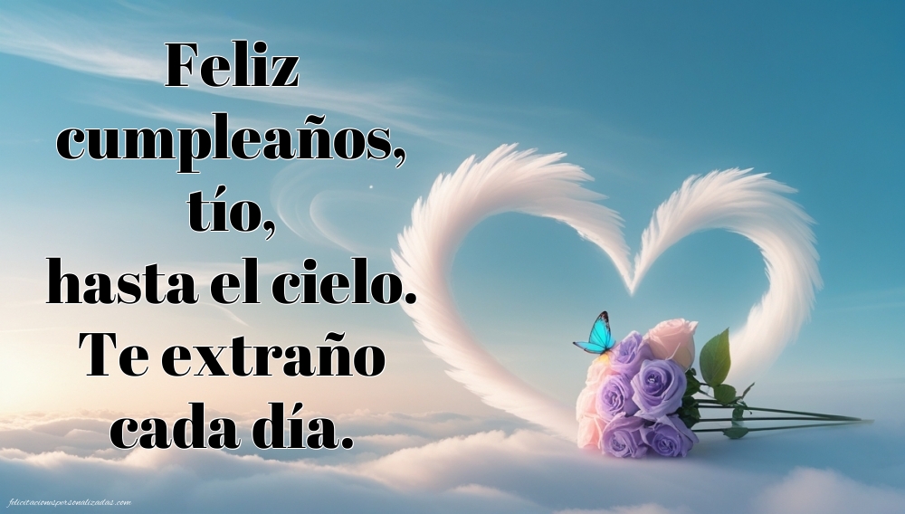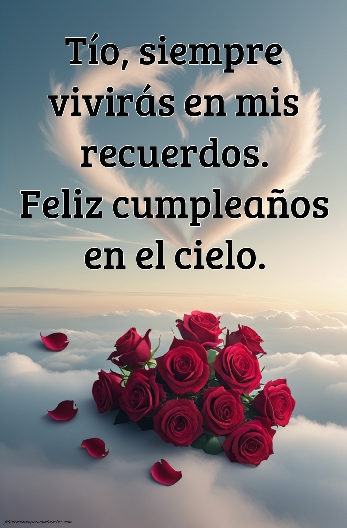 Aunque tu tío ya no esté contigo, su recuerdo vive para siempre en tu corazón. En esta página encontrarás imágenes de feliz cumpleaños hasta el cielo para un tío, con mensajes llenos de amor, nostalgia y agradecimiento. Cada imagen combina frases emotivas con diseños llenos de luz y paz, ideales para compartir en redes sociales, dedicar al cielo o conservar como un homenaje personal. Son palabras que expresan cuánto lo extrañas y celebran su vida con ternura, respeto y cariño. Envía un “feliz cumpleaños hasta el cielo” lleno de amor y esperanza, recordando a ese tío especial que siempre tendrá un lugar en tu corazón. Porque los lazos familiares y el cariño sincero nunca desaparecen, solo se transforman en bellos recuerdos.